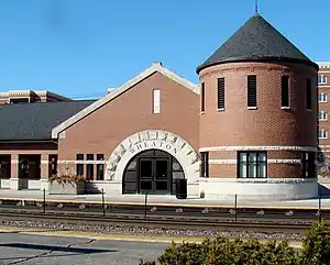 Wheaton is one of two stations on Metra's Union Pacific West Line, located in Wheaton, Illinois. The station is located at 402 Front Street. The station is 25.0 miles (40.2 km) away from Ogilvie Transportation Center, the eastern terminus of the West Line.[2] In Metra's zone-based fare system, Wheaton is in zone E. As of 2022, Wheaton is served by all 20 trains in each direction on weekdays, by all 10 trains in each direction on Saturdays, and by all nine trains in each direction on Sundays and holidays. As of 2018, Wheaton is the 19th busiest of the 236 non-downtown stations in the Metra system, with an average of 1,618 weekday boardings.[1]