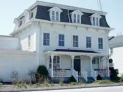 The Wheeler Block is located in the village center of Colchester, facing north across Norwich Avenue to the town green, near the junction with Hayward Avenue. It is a 2+1⁄2-story wood-frame structure in the Second Empire style, with a mansard roof, bracketed cornice, and gable-roof dormers with paired round-arch windows. A single-story porch extends across the front, with turned balusters and bracketed square posts supporting a low-pitch hip roof. An ell extends to the left of the main block. The interior is mainly the product of alterations made in the 1930s, when it was converted for use as town hall.[2]