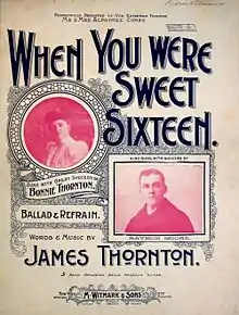 James Thornton was a vaudevillian best-known during his life for his comedy monologues; however, he composed numerous popular songs, especially in 1880s and 1890s.[1] "When You Were Sweet Sixteen", published in 1898, was inspired by Thornton's wife, Bonnie, when she asked her husband if he still loved her. Thornton replied, "I love you like I did when you were sweet sixteen."[2] Bonnie Thornton, a popular vaudeville singer who sang many of her husband's compositions,[3] introduced the song in her act.[lower-alpha 1]
