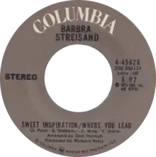"Sweet Inspiration/ Where You Lead" was released 25 May 1972 as the first advance single from the Live Concert at the Forum (the album would be released October 1972): a left-field choice for single release due to its six minute playing time - also in that Streisand's studio take on "Where You Lead" had been her last-but-two single release with neither interim single proving high-profile - , "Sweet Inspiration/ Where You Lead" would approximate the chart impact of the "Where You Lead" single off Barbra Joan Streisand, as the "Sweet Inspiration/ Where You Lead" single peaked at #37 on the Top 40.