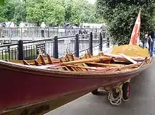 Wherries along the tideway in London were water taxis operated by watermen and in Elizabethan times their use was widespread. A wherry could be rowed by two men with long oars or by a single waterman using short oars or 'sculls'. An Act of Parliament in 1555 specified that a wherry should be "22½ feet long and 4½ wide 'amidships'".[6] and could carry up to five passengers.[7] According to one account concerning Shakespeare's Globe Theatre, "Patrons were transported across the River Thames to Southwark by 'wherry boats'. At one time over two thousand wherries made their way to and from the theatre district."