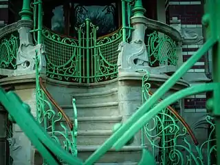 The use of wrought iron or cast iron in scrolling whiplash forms on doorways, balconies and gratings became one of the prominent features of the Art Nouveau style. The architect Victor Horta, who had worked on the construction of iron and glass Royal Greenhouses of Laeken in Belgium, was one of the first to create Art Nouveau ironwork, followed quickly by Hector Guimard, whose iron edibles for the entrances of the Paris Métro became an emblem of the style.