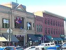 Whiskey Row is a block in Prescott, Arizona, which today exists on Montezuma Street between Goodwin and Gurley Streets, although it did spill over onto adjacent streets from time to time. The original Whiskey Row occupied the 100 block of Montezuma Street, and portions of the adjacent Cortez and Granite Streets. Shortly after Prescott's founding in 1864, an area near the center of town began to accumulate saloons and other entertainment venues. The actual establishment of the district is shrouded in myth and anecdote. However, what is known is that after the fire of 1877, the current placement of Whiskey Row became more established, even though the name "Whiskey Row" did not appear in print until 1883, after a second fire destroyed most of the block. A third devastating fire, in 1900, led to the district being rebuilt once more, although several of the early establishments continued on after the rebuilding. At one point, there were more than 40 saloons standing next to one another in the district.