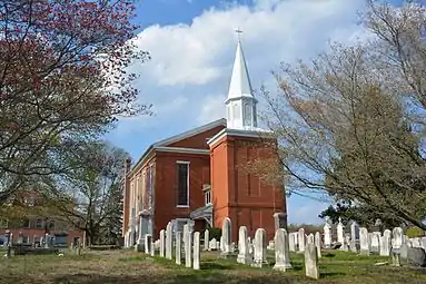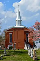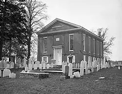 White Clay Creek Presbyterian Church is a historic Presbyterian church located near Newark, New Castle County, Delaware. The current structure was built in 1855, and is a two-story brick structure, nearly as tall (about 40 feet) as it is wide (45 feet). The building measures 63 feet deep. The exterior features brick pilasters and tall stained glass windows. A 1996 addition to the front of the building contains an elevator to the second floor sanctuary and is topped by a steeple.[2] It was preceded by a structure built in 1752. The church was organized as early as 1709 to serve Scotch-Irish Presbyterians at White Clay Creek.[3] The original White Clay Creek Presbyterian Church was built in 1721 about a mile north on the NW Corner of Dewalt Rd and Old Coach Rd. It remains the Old White Clay Creek Presbyterian Church Cemetery.