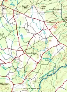 White Creek rises in southeastern White County, Georgia, north of Mossy Creek and west of Leaf, just north of State Route 115.[2] The creek runs generally south-southeast for approximately 4.7 miles, crosses State Route 254 just northeast of Mossy Creek, and then picks up Flat Creek east of Mossy Creek. Less than a mile further, White Creek forms Webster Lake, then winds south for another 2 miles, before flowing into the Chattahoochee River just northeast of Rogers Mill.[3]