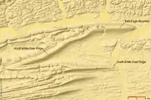 White Deer Hole Creek is in a sandstone, limestone, and shale mountain region, entirely in the Ridge-and-valley Appalachians.[2] South and North White Deer Ridge and Bald Eagle Mountain are composed of sedimentary Ordovician rock, while the valley rock is Silurian, with a small Devonian region closer to the river, in the north.[23] The watershed has no deposits of coal, nor natural gas or oil fields.[24][25] The creek is in a narrow mountain valley with steep slopes in its upper reaches. In its middle and lower reaches it has steep mountain slopes to the south, and a wide valley with rolling hills and gentle slopes to the north. The channel pattern is transitional, with a trellised drainage pattern.[2]