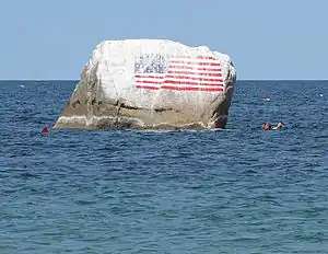 At the north end of the beach is a rock sticking out of the water with an American flag painted on. According to local lore, this act of patriotism was performed to cover a Nazi swastika painted on the rock. In the summer of 1941 local teenagers painted the first flag and went on to join the armed forces after Pearl Harbor was bombed in December 1941. The harsh winter storms washed the flag thin so the swastika showed through. The next Fourth of July the tradition of re-painting the flag was born. Ed Fitzgerald, a White Horse resident, was part of that group. When Ed was of age he also joined the military service and left the tradition to his cousins, the Bradley boys of Priscilla Beach. For years they maintained the flag each Fourth of July until 1985 when family home was sold.