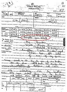 One log shows that Jeremy rang the local police station and spoke to police constable Michael West in the information room.[94] As a result West began an "event log".[95] This states that Jeremy's call came in at 3:36 am on 7 August 1985. Jeremy maintains that he telephoned ten minutes after his father phoned him. But at trial it was accepted that West had misread a digital clock, and that the call had probably come in just before 3:26 am, because that was when West asked a civilian dispatcher, Malcolm Bonnett, to send a car to the scene. The car, Charlie Alpha 5, was dispatched at 3:35 am.[96][lower-alpha 5] The event log noted a call from: