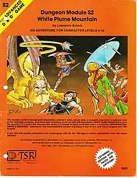 White Plume Mountain is an adventure module for the Advanced Dungeons & Dragons fantasy role-playing game, written by Lawrence Schick and published by TSR in 1979. The 16-page adventure bears the code "S2" ("S" for "special").[2] The adventure is a dungeon crawl where the players' characters are hired to retrieve three "notorious" magical weapons, each possessing its own intelligence.[1] The adventure contains art by Erol Otus, and a cover by Jeff Dee. A sequel, Return to White Plume Mountain, was published in 1999, and an updated version conforming to v3.5 rules was released online in 2005. The original was again updated for the 5th edition in 2017 as the fourth part of Tales from the Yawning Portal.