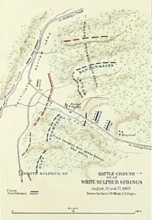 The following army units were involved in the Battle of White Sulphur Springs on August 26 and 27, 1863, in the American Civil War. Although the battle took place near White Sulphur Springs, West Virginia, it has also been called the Battle of Rocky Gap, the Battle of Dry Creek, the Battle of Howard's Creek, and the Battle of the Lawbooks. A Confederate Army force led by Colonel George S. Patton Sr. successfully repelled a Union Army brigade led by Brigadier General William W. Averell.