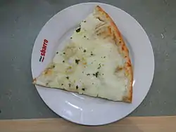 White pizza or a white pie is an Italian-style pizza that does not use tomato sauce. The pizza generally consists of pizza dough, olive oil, garlic, cheese, salt and sometimes toppings including vegetables such as spinach, tomato, and herbs.[1][2][3][4] Ricotta is a common type of cheese used on white pizza in the United States.[4] Sometimes white sauces such as bechamel are used.[4]