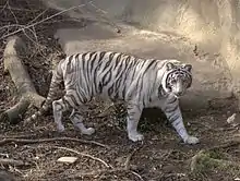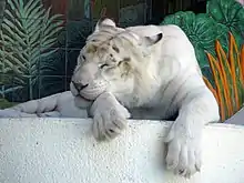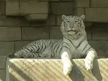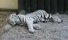 The white tiger or bleached tiger is a leucistic pigmentation variant of the Bengal tiger, Siberian tiger and hybrids between the two. It is reported in the wild from time to time in the Indian states of Madhya Pradesh, Assam, West Bengal, Bihar, Odisha, in the Sunderbans region and especially in the former State of Rewa.[1] It has the typical black stripes of a tiger, but carries a white or near-white coat.