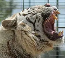 Outside of India, inbred white tigers have been prone to crossed eyes, a condition known as strabismus,[15] due to incorrectly routed visual pathways in the brains of white tigers. When stressed or confused, all white tigers cross their eyes.[16] Strabismus is associated with white tigers of mixed Bengal x Siberian ancestry. The only pure-Bengal white tiger reported to be cross-eyed was Mohini's daughter Rewati. Strabismus is directly linked to the white gene and is not a separate consequence of inbreeding.[17][18][19]