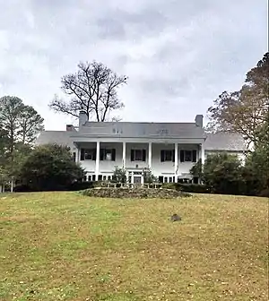 The house was designed by architect George Watts Carr.[5][1] Noted for its similarity to Mount Vernon, it has been considered one of the most elaborate examples of Colonial Revival architecture in Durham and, at the time it was built, was the largest home in the neighborhood.[4][5][1] It is located on the corner of Markham Street and Knox Street in the affluent Duke Park neighborhood, a suburb of downtown Durham.[2][6][5] Built in the Colonial Revival style, featuring a symmetrical façade and two-story portico, it was one of the first houses on the north end of the Duke Park.[2][5] The architecture includes Neoclassical cornices and molded lintels above the French doors opening onto the front patio.[5] The entrance has a curved pediment decorated with modillions and foliate plasterwork.[5] The central hall leads to a large porch and parterre overlooking Mangum Street.[1] On the south side of the house is a music room, formal living room, library, and a swimming pool and terrace.[1] On the north side of the house is a formal dining room, sitting room, and breakfast room.[1] A small guest house is also located on the property.[5] The garage is connected to the main house by a curved arcade.[5] Additions were made in 1940, including a new kitchen on the ground floor and more bedrooms upstairs, which doubled the size of the house to 6,000 square feet.[1]