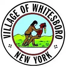 The Whitesboro seal, originating in the early 1900s, displays founder Hugh White wrestling an Oneida Native American.[8] The seal has been controversial because it has been interpreted as a settler choking the Native American; city officials contend it depicts a friendly wrestling match that White won, gaining the respect of the Oneida.[9] The current version of the seal was created in 1970, after a lawsuit by a Native American group: the version used before the suit showed the settler's hands on the Native American's neck instead of his shoulders.[10] In 1999, Mayor John Malecki suggested a contest for a new seal, but received no submissions.[11]