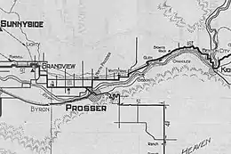 The settlement of Valley Heights originated in 1907 when Seattle developer Charles Jorgen Smith, purchased property in present-day Whitstran, which became known as Valley Heights Orchard Tracts.[3] It was also called Swede Settlement for a time because of a number of Scandinavians who purchased property in the area. A rail line was built in 1911 and a town site was platted by Mary Biggam. By 1919 the community began to be known as Whitstran and the name Valley Heights eventually faded from use.[4]