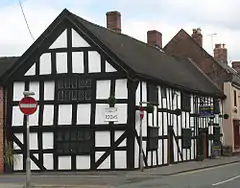 The former Widows' Almshouses are an L-shaped building on the corner of Welsh Row and Second Wood Street. The 17th-century part of the building faces Welsh Row and comprises a terrace of three black-and-white cottages with a timber frame infilled with bricks under a tiled roof.[1] It has six bays and two storeys, with a gabled end to Second Wood Street.[1][20] A two-storey 19th-century extension in brick faces Second Wood Street.[1]