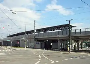 Wien Geiselbergstraße is a railway station serving Simmering, the eleventh district of Vienna.[1][2] It is located on an elevated s-curve and was built during the 2002 relocation of parts of the Aspangbahn.[3]