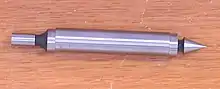 A center finder is a tool used to align the machining center to a precision location on a work piece. Often these locations might be marked using a layout method (coating the surface with layout stain and scribing a precise location with the intersection of the two lines identifying the position to be machined, etc. Sometimes a magnifying glass is used to assist in marking the location. One drawback of this method is that it is only as accurate as the lines that are drawn on the part.). In contrast to the edge finder, in the mechanical versions, the tip is not spring-loaded, and it works with the spindle stopped. In laser versions, an 'X' of light is often projected from the machining center onto the work piece and the work piece location is adjusted to align with the intersection of these lines. In contrast to centering devices, the center finder cannot directly find the center of a work piece, thus requires additional calculation, measurement and/or layout method to align to.