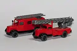 In the early 1960s, Volkswagen's Wolfsburg plant commissioned vehicles in a larger 1:40 scale with unique company designed packaging. These are rather rare today - and often worth more than $100, though some of these larger scaled models have been reissued by the company.[4] Particularly interesting was a Wiking Beetle promotional molded in a clear plastic body. It was labeled "Das Gläserne Auto" and available in a special red and blue display box with body, wheels, interior and seats displayed apart from each other.[5] The presentation with clear plastic body hit a chord and the idea was copied by several other manufacturers - even in Britain where one manufacturer produced its own 'glass' car[6]