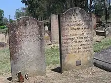 The earliest burials in Wilberforce Cemetery were of three drowned men, James Hamilton (Hambleton), Joseph Ware and John Tunstal on 13 December 1811, but their gravesites are unknown.[7] Margaret Chaseling was buried in the cemetery in October 1815 and is the oldest burial for which the site is known.[8] Soon afterwards, Anthony Richardson, a Second Fleet arrival, was buried on 4 February 1816. His burial marker is the oldest to survive.[9] A schoolhouse-cum-chapel was also erected on the church site nearby so that the Macquarie ideal of the church, school and burial ground on the highest point demonstrating order and religion was realised in the town of Wilberforce.[1]