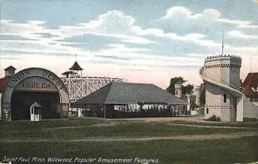 Wildwood Amusement Park was an amusement park and picnic grounds that existed from 1889 to 1932 on the southeast shore of White Bear Lake in Mahtomedi, Minnesota, United States.[1] The park was built and operated by the Minneapolis and St. Paul Suburban Railroad Company, a subdivision of the Twin City Rapid Transit Company, which ran a streetcar line from Mahtomedi to nearby St. Paul.[2] It was the sister park of Big Island Amusement Park on Lake Minnetonka, as both were intended to draw crowds of people to opposite ends of the Minneapolis-St. Paul streetcar system on weekends.[3] Wildwood Amusement Park proved to be more successful than Big Island Amusement Park, which closed in 1911, and lasted until 1932 when financial losses brought about its demise.[4]