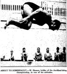 After day 1 of the event in which 5 dives were performed Hassan had "established a lead for the championship".[111] Then on day 2 of the diving which concluded the event Hassan won the national title in heavy rain. His win "caused great enthusiasm among the Auckland team, because, although every swimming title has been held in Auckland, he is the first Aucklander to win the diving for 14 years". He finished ahead of future All Black Arthur Wesney and R.O. Johnson. He was also part of the Auckland team which won the Yaldhurst Shield for the best overall team.[112] After returning to Auckland he won the Mount Eden Carnival over R. Frankham.[113] The New Zealand Herald wrote that no victory at the "New Zealand championship meeting was more deserved than W. Hassan’s in the men’s diving championship. His opportunities for diving in Auckland are restricted, because in regard to spring, height from the water and depth of water beneath, the boards are poor and unworthy of a city actively interested in natation. Hassan found the boards at St. Albans baths [Christchurch] the best in his experience, and certainly he performed splendid dives.[114]