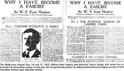 In 1933, he published a series of articles in the Melbourne Herald, titled "Why I Have Become a Fascist". In one article, he wrote that fascism "endeavours to avoid the egotistical attitude of laissez faire and the inertia of socialism". Kent Hughes saw it as "a half-way house between the two systems". In fascist countries, he said, "industrial peace and security have been found to be worth the price of sacrificing some of the individual liberty previously enjoyed". In what he called "British communities", however, he expected that fascism would "be garbed not in the dictatorial black shirt, but in the more sedate style of the British Parliamentary representative".[2]