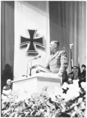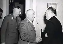 During Ritterbusch's time in office as Commissioner-General, the influence of the NSDAP party apparatus in the Netherlands was strongly repressed in favour of an expansion of the SS power base in the occupied country. This was precisely what Himmler had set as his goal before Schmidt's appointment. Schmidt had put many obstacles in the way of the SS. Accordingly, Himmler demanded that Schmidt's successor must be a "strict representative of the Greater Germanic line".[9] Bormann who, since 1942, had pursued a policy of submissive cooperation between the party and the SS, had bowed to this claim with the appointment of Ritterbusch. At a meeting held in The Hague on 30 July 1943, shortly after Ritterbusch's appointment, he was informed by Seyss-Inquart that unconditional loyalty to the SS leadership was a requirement of his future work. The SS representative, Hanns Albin Rauter, judged Ritterbusch as a "quiet, very orderly man of a pastoral character"[10] because of his obedient administration. According to the SS he refrained from interfering in their "political shaping" and was an exponent of the party who favored the politics of the SS. He was viewed as weak and did not cause the SS any difficulties. Bormann also conceded in a later report that Ritterbusch was not very energetic. However, he rejected the idea of Ritterbusch being appointed head of the NSDAP's main archive as proposed by his co-worker Walkenhorst, who characterized him as a "kind of party philosopher".[11] In history books, Ritterbusch has also mostly been described as a "colourless party functionary".[12]