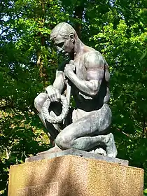 After Germany's defeat in World War I, many artists entered a period of financial distress as public commissions and private clients were difficult to find. At times, he had to feed his six children at the local soup kitchen.[1] His only work came from military societies, seeking to memorialize their fallen comrades. In 1925, he had to sell his home and studio in Berlin, returning to his birthplace of Plau to reduce expenses. The people there greeted their famous son enthusiastically, creating a display of his plaster casts in a room at the local schoolhouse.[3] This mini-museum was in operation until 1947. Even though he was politically conservative, he joined the National Socialist party in 1930, perhaps to ensure his employability.[1]