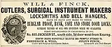 Will & Finck was a San Francisco company established in 1864 as cutlers, surgical instrument makers, locksmiths and bell hangers. The company closed in 1932.