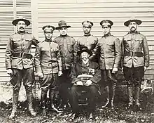 Five of his sons would fight in World War I and one in the Spanish–American War.[5] A photo of the six sons and their father, all in military uniform, would appear in the NAACP's magazine, The Crisis, in December 1917.[63][67][68] The three youngest sons, all officers, were training to go and fight in World War I in France.[63][67][68] Gould's great-grandson would describe them as "a family of fighters."[19]