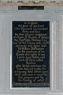 Blaxton joined the failed Ferdinando Gorges expedition to America in 1623, and he arrived in Weymouth, Massachusetts in 1623 on the ship Katherine[5] as a chaplain in the subsequent expedition of Robert Gorges. Most of his fellow travelers returned to England in 1625, and he became the first colonist to settle in Boston, living alone there. Isaac Johnson landed with the Puritans in nearby Charlestown in 1629 but they had problems finding potable water,[6] so Blaxton invited them to settle on his land in Boston in 1630. Blaxton and Johnson were university contemporaries from Emmanuel College, Cambridge.[7][8] The Puritans granted Blaxton 50 acres (200,000 m2), but he sold it back to them in 1634, and this land now makes up Boston Common, a central public park in downtown Boston.