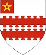 ![]() Brokesby of Shoby arms:- argent, 2 bars nebuly gules, on a canton gules a mullet pierced or.[1] | |