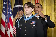 Swenson received the Medal of Honor from President Barack Obama on October 15, 2013.[23] Swenson was nominated for his actions as an Embedded Trainer in the Battle of Ganjgal near the Afghanistan-Pakistan border on September 8, 2009. He is reported to have repeatedly entered the "kill zone" in order to rescue wounded American and Afghan soldiers, much like his fellow serviceman Dakota Meyer who was awarded the Medal of Honor in 2011.[9] Swenson became the first living officer to receive the Medal of Honor since Vietnam.[24]