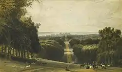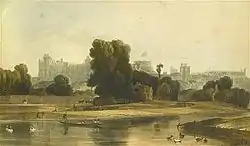 Daniell's last great artistic work was produced between 1827 and 1830. Over this time he became interested in the scenery around Windsor. In 1827, 1828 and 1830, he exhibited a total of five oil paintings of Windsor Castle and its surroundings and two oil paintings of Virginia Water, at the Royal Academy Exhibitions. These were considered to be among his finest oil paintings, and according to Sutton, his view of the Long Walk at Windsor was generally acknowledged to be his masterpiece in oils. Daniell produced a set of 12 aquatints of the Windsor and Virginia water views. Sutton writes of this series: