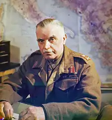 In February 1944, he was made General Officer Commanding-in-Chief (GOC-in-C) for Southern Command.[1] While still appointed a temporary lieutenant-general, Morgan's permanent rank was advanced to major-general in May 1944.[14] In March 1945[15] he became Chief of Staff to the Supreme Allied Commander in the Mediterranean Theatre, Field Marshal Sir Harold Alexander. In May 1945, he accepted the surrender of all Axis forces on the Italian Front.[1][6] In September 1945 he was appointed Deputy Supreme Allied Commander for the Mediterranean Theatre and then in October succeeded Alexander as the Supreme Allied Commander.[1][6] Also in October he was made Knight Commander of the Order of the Bath.[16] The Morgan Line, which at one time demarcated the boundary between Italy and Yugoslavia, was named after him.[17]