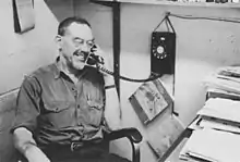 Becoming an Associate in Physical Oceanography at Woods Hole Oceanographic Institution (WHOI) in Massachusetts in 1943, Bill Schevill's first work regarded US Naval auspices investigating echo-location of U-boats. Indeed, he had been rejected for military service because of chronic iritis, he joined a small group that worked with Allied submariners on observing the temperature of the ocean's upper levels so as to exploit it for stealth when dealing with enemy sonar.[4] As he later wrote in 1962: "During World War II many people on both sides listened to underwater sounds for military reasons. Not only the wanted sounds (those made by enemy ships), but a bewildering variety of others were heard. Most of these were ascribed to animals living in the sea, usually as “fish noises” ... Some were ascribed to whales, in part correctly, but without identification of the kind of whale; most military listeners were not biologists, and in any case the traditional naval sonar room is woefully deficient in windows."[21] Such maritime work inspired him and, leaving Palaeontology behind, led William E. Schevill become "one of the world's most innovative whale biologists and an undisputed pioneer in the field of whale sounds,"[20] performing the first recordings of underwater sounds and extrapolating their purpose from these recordings. In accordance with his groundbreaking work, Schevill published over fifty papers on whale phonation and thus provide the framework for “literally hundreds of scientific studies produced by other workers from the 1960s until the present day."[22] However, it is worthy of note that his wife Barbara Lawrence, by now the MCZ's Curator of Mammals, often co-wrote these documents with him.[3] However, in spite of his change in field, it is reported that Bill Schevill split his time equally between the MCZ and the WHOI - his work with the latter likely relating to Cetology as opposed to fossil studies.[4]