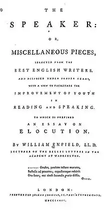 His most successful work, however, was The Speaker (1774), an anthology of literary extracts intended to teach elocution, and produced first for his Warrington pupils.[3] He published a sequel, Exercises in Elocution in 1780. Enfield's Speaker remained in print until the middle of the nineteenth century and inspired other anthologies, such as Mary Wollstonecraft's The Female Speaker.