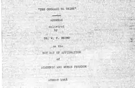 14 August 1968, Nkomo was invited to speak at the University of Cape Town's Day of Affirmation of Academic and Human Freedom.[10] His address, The Courage to Think[11] followed in a series after that of Robert Kennedy's Ripple of Hope speech in June 1966. In his speech he said, "The idea of a common patriotism and nationalism was always recognised by all. It was only in recent times with the emergence of apartheid theoreticians that the country definitely deviated from the path of a common nationalism."