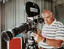 Wilson's love for sports led him to become one of the most accomplished cinematographers in that category.[1] He worked for Louis W. Kellman's Newsreel Laboratory in Philadelphia and Tel-Ra Productions, two prominent producers of sports programming during the 1950s and 1960s.[6] He was the principle cinematographer for numerous popular television sports programs including Tele-Sports Digest[4] and Gillette Cavalcade of Sports. Tele-Sports Digest was an early forerunner of ABC's Wide World of Sports and other television sports highlight programs.[1] Wilson traveled more than 2,000,000 miles (3,200,000 km), crisscrossing the nation filming major sporting events including 30 baseball World Series, 20 baseball All-Star games, 30 Kentucky Derby horse races, 20 Masters golf tournaments, 15 U.S. Open golf tournaments, 15 Indianapolis 500 auto races, 6 Stanley Cups and hundreds of college and pro football games including 13 NFL Championships and Super Bowl I and Super Bowl II.[1] He filmed numerous boxing championship matches involving Rocky Marciano, Sonny Liston and Jake LaMotta. His cinematography is immortalized in scores of college football highlight films for major universities including Notre Dame, Ohio State, Penn State, Alabama, Boston College and scores of others. He filmed more than 20 college football bowl games.[1] For filming football he typically used a 16mm Arriflex M (Arri) fitted with an 85-250mm Nikkor zoom lens. He was a regular cameraman for Winik & Winik Productions in New York City, Major League Baseball Productions, NCAA Football and the New York Racing Association. He filmed nearly every Army-Navy football game between 1955 and 1995. His cinematography for a Breeders Cup film was nominated for an Emmy.[4] As a cameraman, Wilson was a fixture at World Series games and was so well known around the baseball diamond that former President Richard Nixon once asked him to make introductions to one of his favorite Oakland Athletics players.