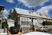 The verandah sits at half level above Gloucester St, and is accessed via stone stairs. It has timber rectangular columns with timber capitals, and an unpainted timber boarded ceiling. The dormer above has a hipped roof, and the half-round guttering is decorated with cresting at the corners. A sandstone and brick chimney rises above the roofline. The windows are multi-paned timber sliding sash windows, and have textured sandstone lintels, quoins and sills; the doors also have textured sandstone surrounds. The eastern attic window is flanked by two timber rails which may have been a lifting device. The rear wing has a hipped corrugated iron roof which adjoins that of its neighbour. A small brick and corrugated iron outhouse sits to the west of the kitchen.[1]