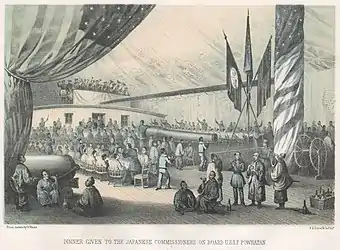 Under Perry's orders, McCluney prepared the Powhatan for a celebratory dinner for the Japanese commissioners. Monday, 27 March 1854, a giant awning covered the Powhatan's deck. Flags of both nations flew for the Japanese guests and the American hosts. The commissioners were entertained by Perry and his captains in the commodore's cabin. The rest of the Japanese officials and guests were entertained with an American minstrel performance on deck.