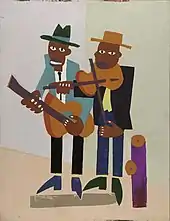 Johnson joined the WPA federal art project and with the help of Mary Beattie Brady, Johnson eventually found work as a teacher at the Harlem Community Art Center. There he and other teachers instructed about 600 students per week, as part of a local Federal Art Project supported by the Works Progress Administration. Through the center Johnson met important Harlem inhabitants such as Henry Bannarn and Gwendolyn Knight.[4]: 124 He immersed himself in African-American culture and traditions, producing paintings that were characterized by their folk art simplicity.[13] Johnson was determined to "paint his own people".[4]: 123 He celebrated African American culture and imagery in the urban settings of pieces such as Street life - Harlem, Cafe, and Street Musicians, and in the rural settings of Farm Couple at Work, Sowing, and Going to Market. Harsher realities of Negro life were depicted in Chain Gang and Moon over Harlem, which was a response to the 1943 racial riots in New York. Another series of works showed war-time soldiers and nurses.[4]: 123–180 His pieces emphasized striking and vibrant colors and simplistic figures, and his depictions of African American culture began to draw on his upbringing in the rural South. Additionally, he employed religious and political motifs throughout his work. He aimed to illustrate the richness of the African culture and the modernism of the Harlem Renaissance. The style as well as texture of the pieces demonstrated Johnson’s message. In his Jitterbugs paintings, Johnson began experimenting with the relatively unused technique of screen printing, allowing for a quickness and suppleness of the painting. This layering of paint created an intentional appearance of grittiness and roughness to the image. Johnson used this technique to appeal to an aesthetic of durability and perseverance in his subjects.[14] Johnson held a solo exhibition at Alma Reed Galleries in 1941.[3] However, although he enjoyed a degree of success as an artist during the 1940s and 1950s, he was never able to achieve financial stability.[3]