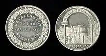 Indeed, he appeared to have almost had a monopoly on London's tavern tokens in the mid-nineteenth century.[3] Early tokens, produced from 1844-5 were of a higher quality than the standardised form of copper token they became later.[37] Public houses who Taylor issued tokens for included: the Horns & Chequers in Limehouses;[38] St Helena Gardens in Rotherhithe;[39] the General Napier in Pimlico;[40] The Florence - Billiard & Skittle Rooms;[41] Middlesex Music Hall;[42] Marylebone Music Hall;[43] the Old Welsh Harp Inn;[44] Audinet Restaurant;[45] the Traveller's Rest in Shepherd's Bush;[46] the Downham Arms, Islington;[47] the Blue Bull, Grantham.[3] He produced canteen tokens for the Honourable Artillery Company,[48] and for the 37th Middlesex Regiment's Camp.[49] His tokens were used as railway tickets used in the north-east.[50]