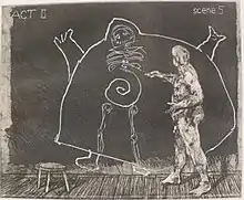 In 1996–1997, he produced a portfolio of eight prints titled Ubu Tells the Truth, based on Alfred Jarry's 1896 play Ubu Roi. These prints also relate to the Truth and Reconciliation Commission conducted in South Africa after the end of apartheid.[8] One of the stark and somber prints from this portfolio, in the collection of the Honolulu Museum of Art, is illustrated.