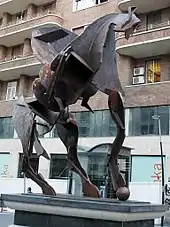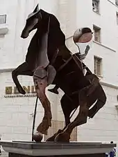In 2009, Kentridge, in partnership with Gerhard Marx, created a 10m-tall sculpture for his home city of Johannesburg entitled Fire Walker. In 2012 his sculpture, Il cavaliere di Toledo, was unveiled in Naples.[20] Rebus (2013), referring in title to the allusional device using pictures to represent words or parts of words, is a series of bronze sculptures that form two distinct images when turned to a certain angle; when paired in correspondence, for example, a final image – a nude – is created from two original forms – a stamp and a telephone.[21]