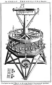 The main survey instrument from 1802 for the primary triangles was a Great Theodolite made by William Cary. This was very similar to the instruments used in France and Britain for previous trigonometrical surveys. It had a horizontal circle that was 36 inches wide and the readings were taken using a microscope. The vertical graduated circle was 18 inches in diameter.[9] It weighed about half a ton and needed twelve men to carry it. Lambton measured all three angles of triangles in several cases to establish the spherical excess (angles of triangles on a sphere sum up greater than 180°). When the survey was carried out from Madras to Bangalore, Lambton was able to compare the Bangalore baseline of 1804 with the calculated measurements and the difference was about three and a half inches.[14]