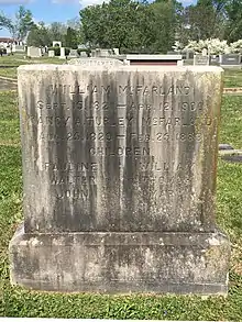 McFarland died in Morristown on April 12, 1900 (age 78 years, 194 days),[22] and was interred at City Cemetery. He was later reinterred at Emma Jarnagin Cemetery in Morristown.