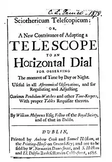 Molyneux also published several papers in Philosophical Transactions, as well as papers on optics, natural philosophy, and miscellaneous topics.[7] Perhaps his best known scientific work was Dioptrica Nova, A treatise of dioptricks in two parts, wherein the various effects and appearances of spherick glasses, both convex and concave, single and combined, in telescopes and microscopes, together with their usefulness in many concerns of humane life, are explained, published in London 1692.[7]